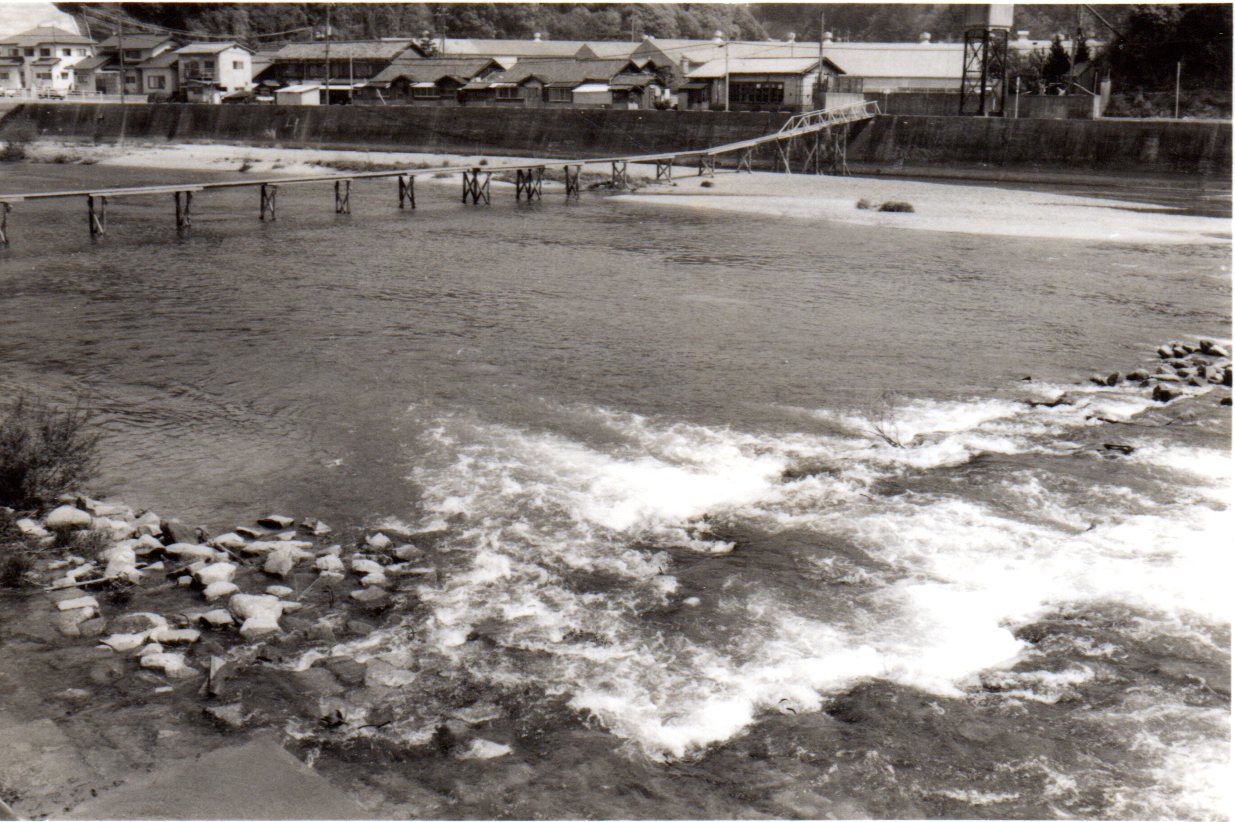 川の長さは約100mに達していましたが、橋の幅員は1m余りであったと記憶しています。幾つもの木製の橋脚の上に約1mの横板を並べているものが、